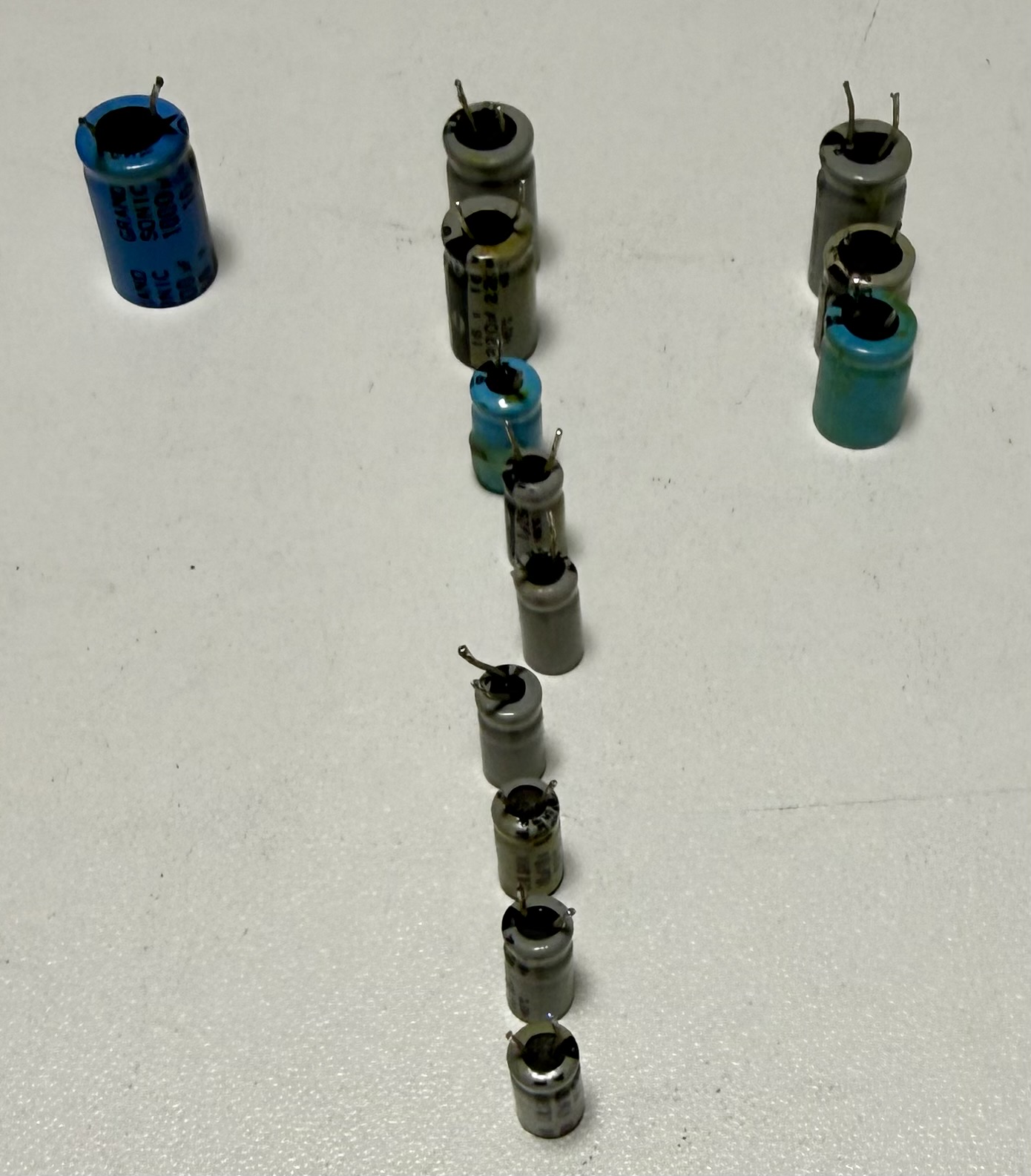 Des weiteren habe ich die alten und teilweise sehr schlechten Elkos gewechselt. Ein Elko (im Bild ganz links) hatte gar keine Kapazität mehr, lediglich drei (im Bild ganz rechts) waren noch von guter Qualität.