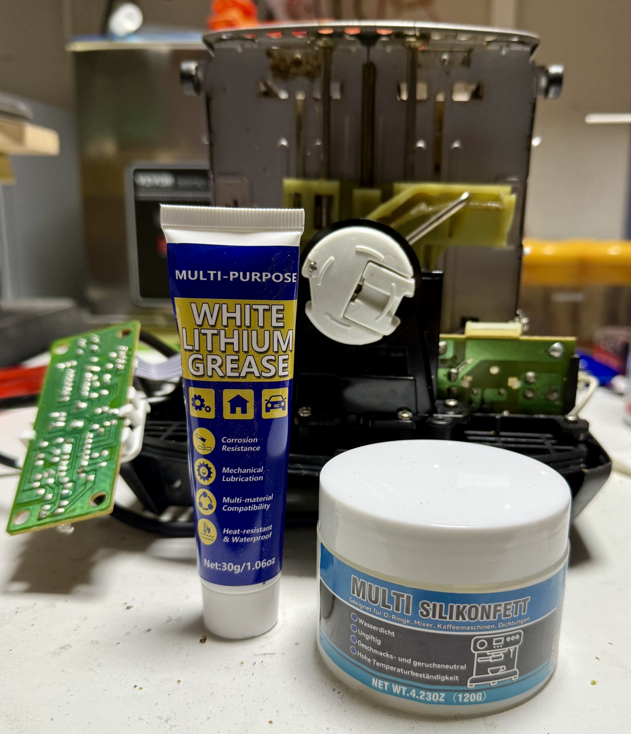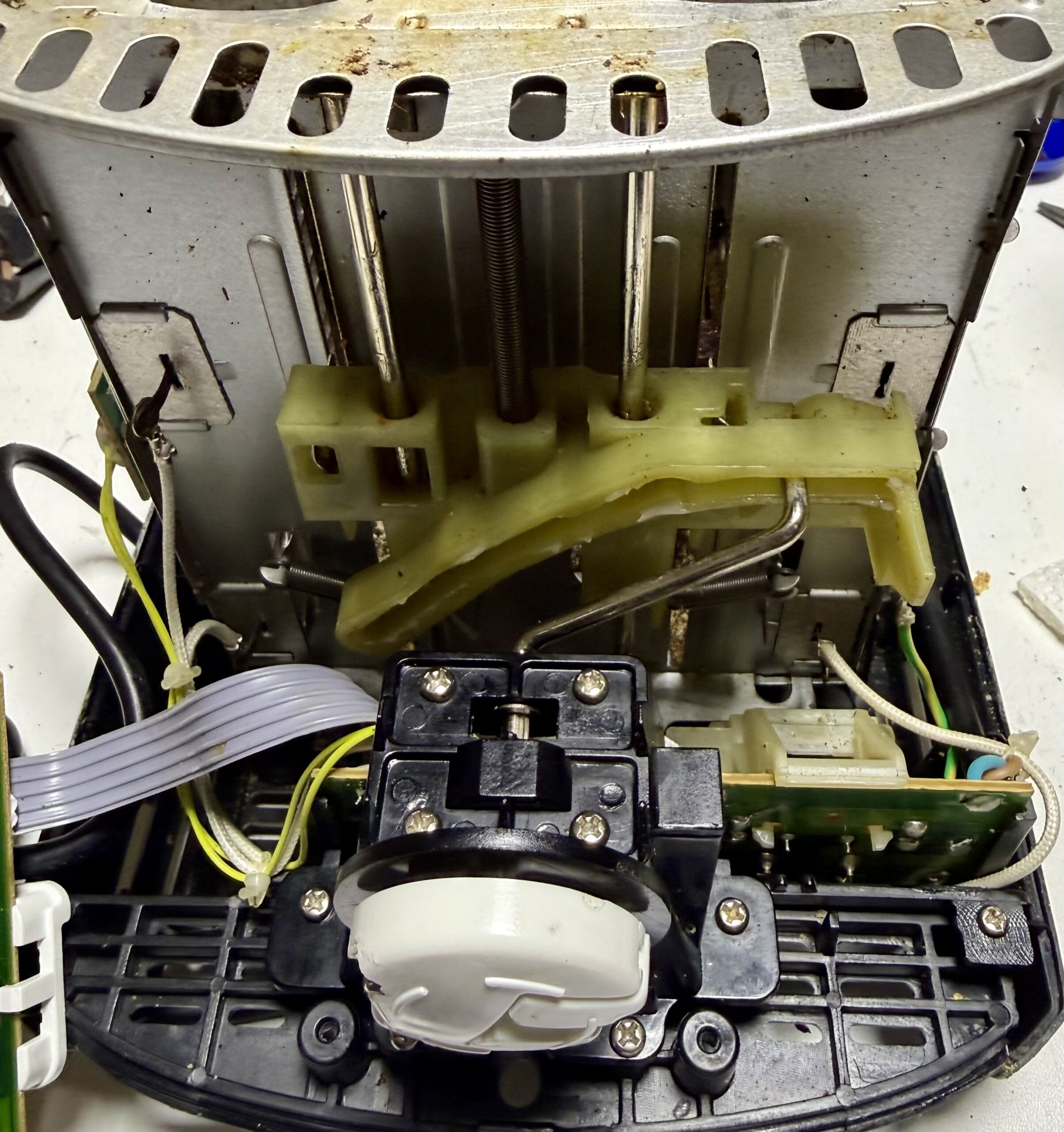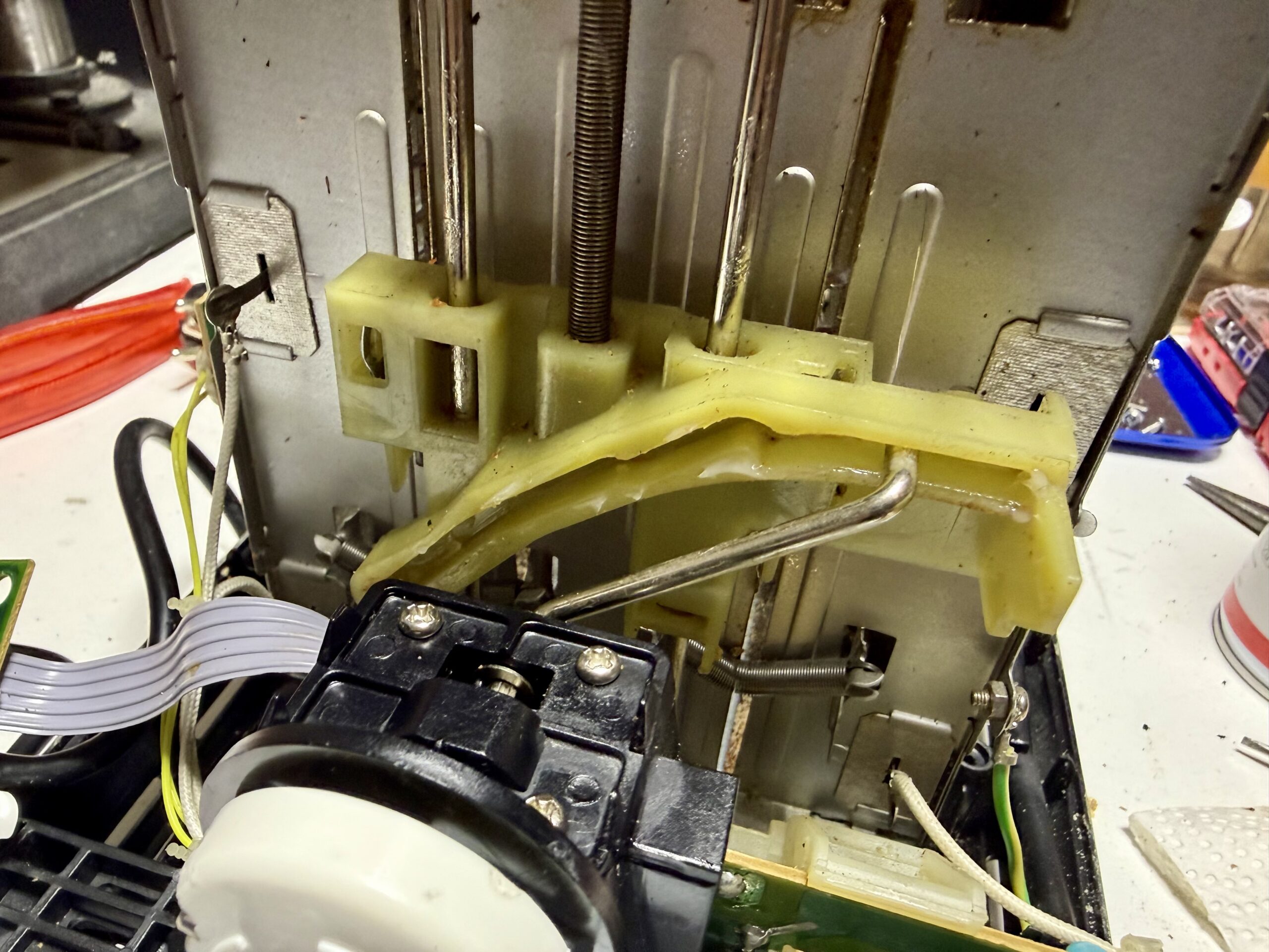 Einmal demontiert, habe ich die Mechanik neu gefettet, die Gleitschienen mit Lithiumfett, die Führung für das Einschalten und Absenken mit Silikonfett.
