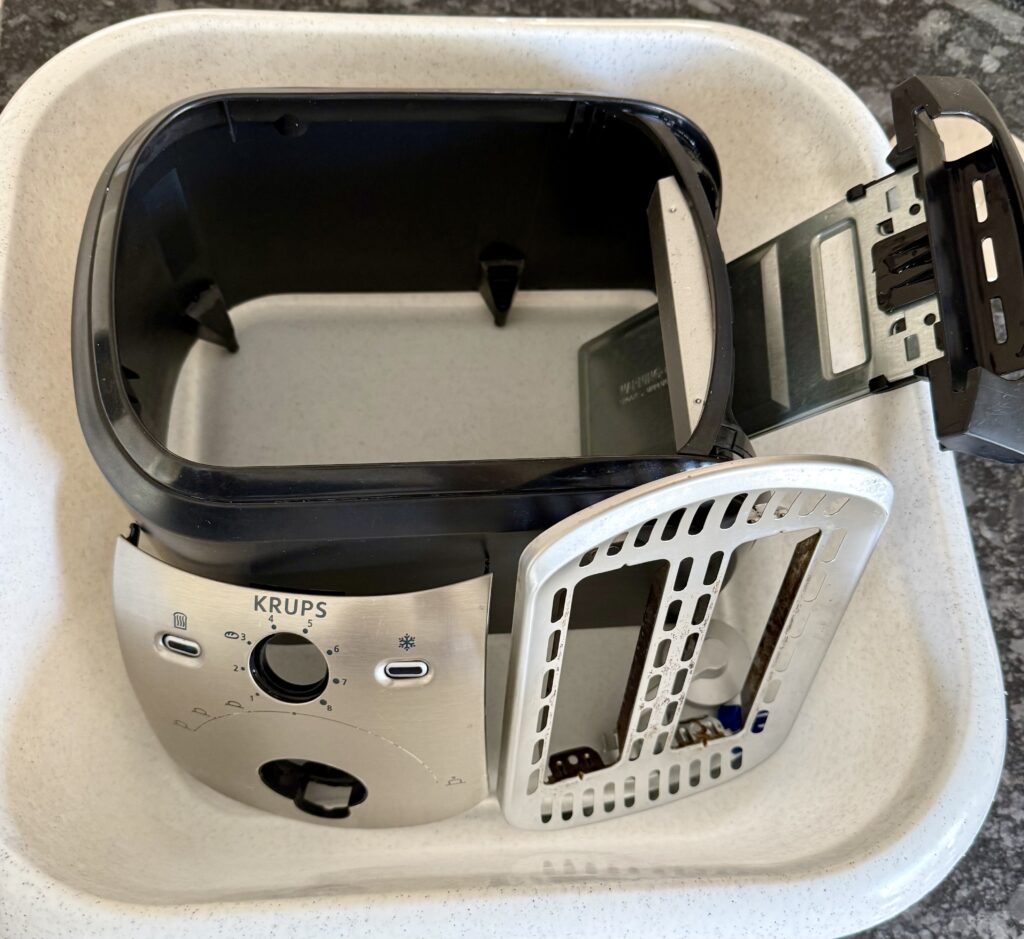Das Öffnen des Krups Toast Control FEM 241 ist ein Erlebnis! Da kommt kein Mensch von allein drauf, wie der im Werk montiert wurde. Glücklicherweise fand ich eine Anleitung: