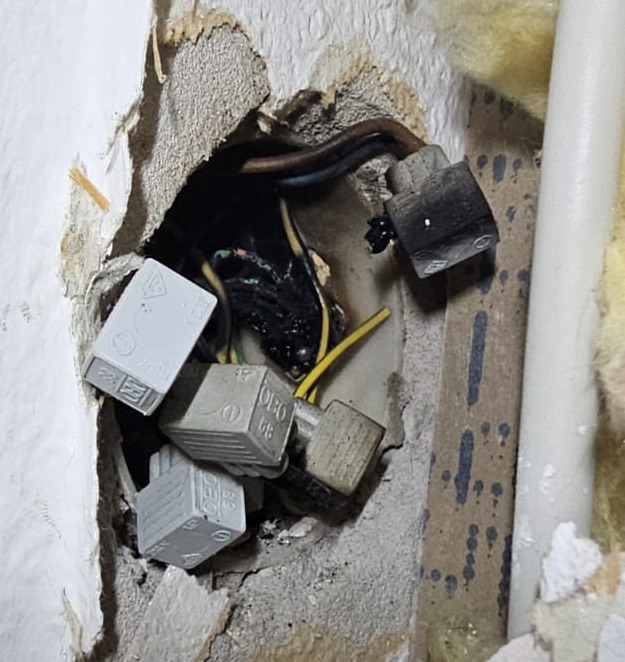 Im Zuge eines Umbaus hat der Vorbesitzer des Hauses eine neue Rigips-Wand eingezogen. So weit, so gut. Allerdings – bitte hinsetzen – hat er selbige genau über einen Schalter samt Steck- und Verteilerdose gebaut. Mit anderen Worten: Die Verteilerdose war in der Wand (s. Titelbild, gemeint ist nicht die orangene Hohlwanddose, sondern die dahinter erkennbare im Mauerwerk).