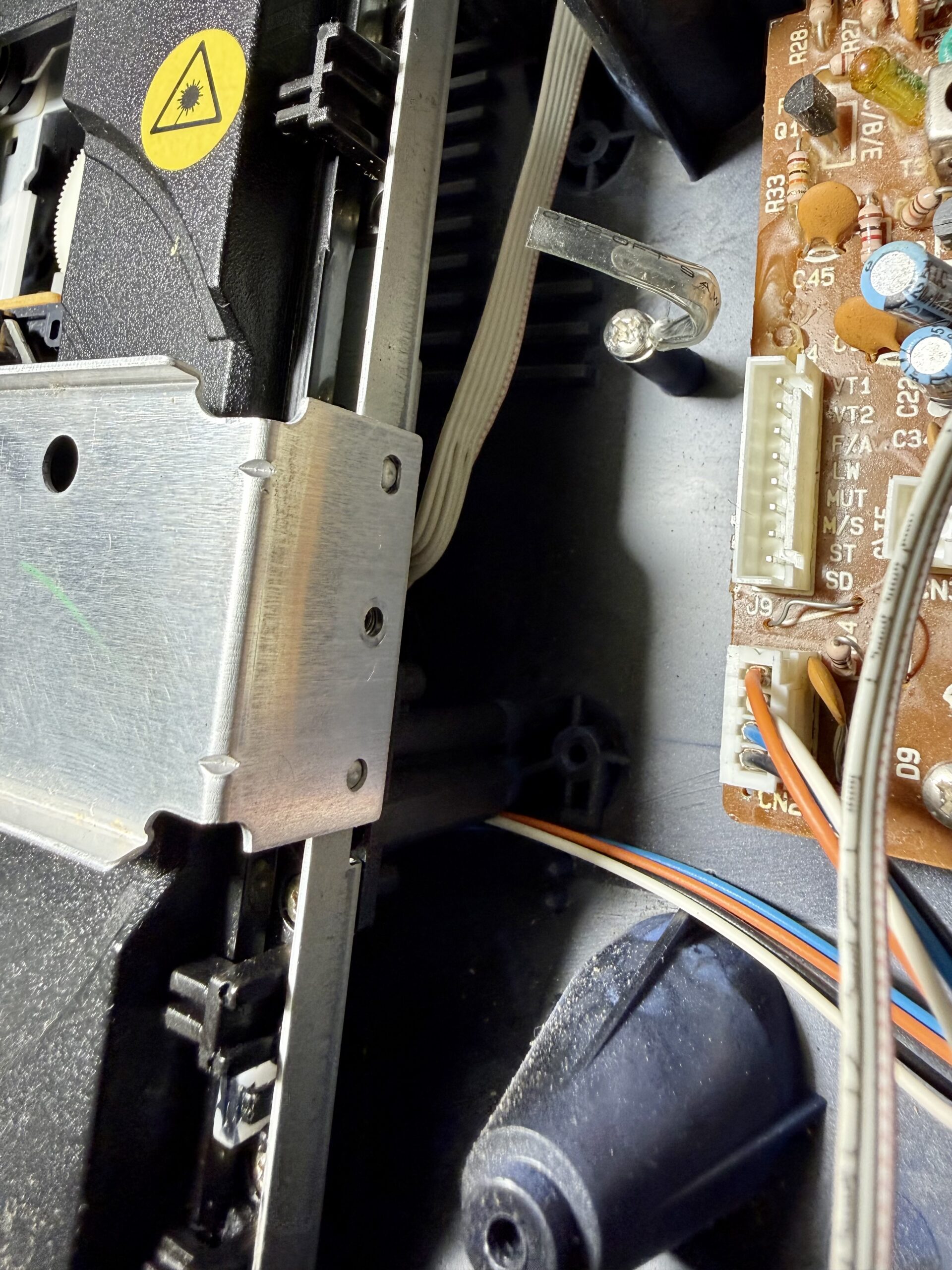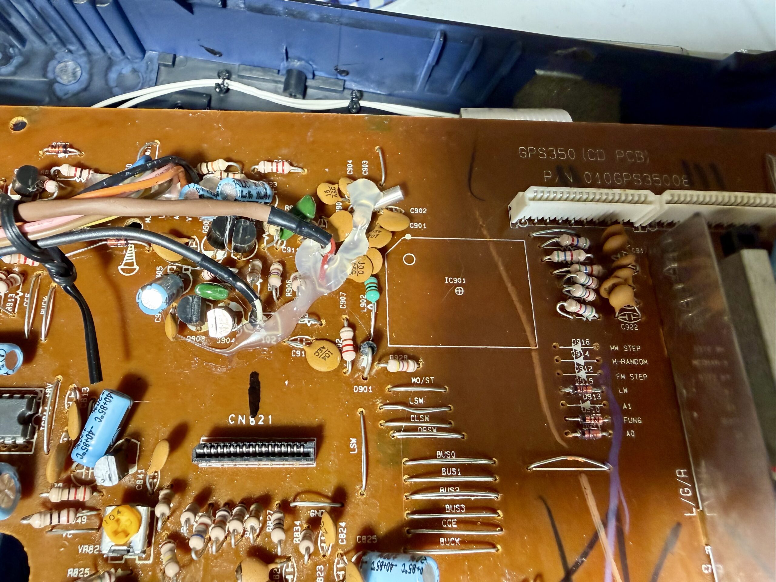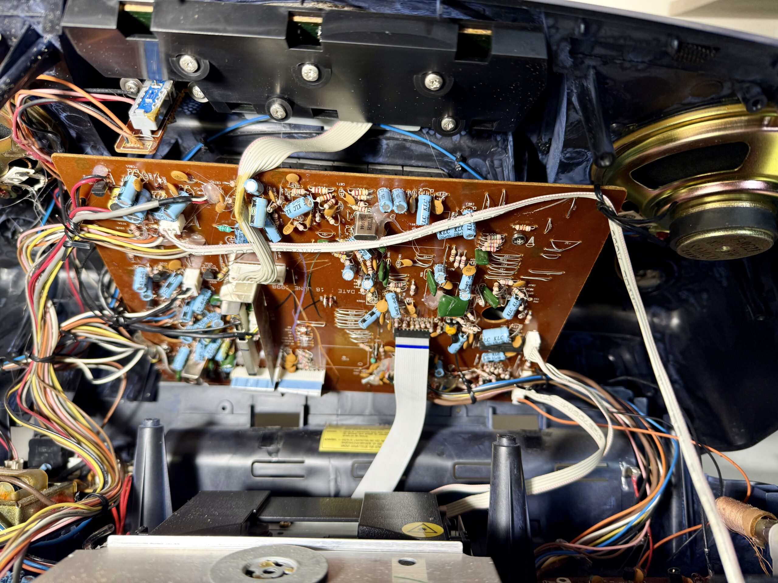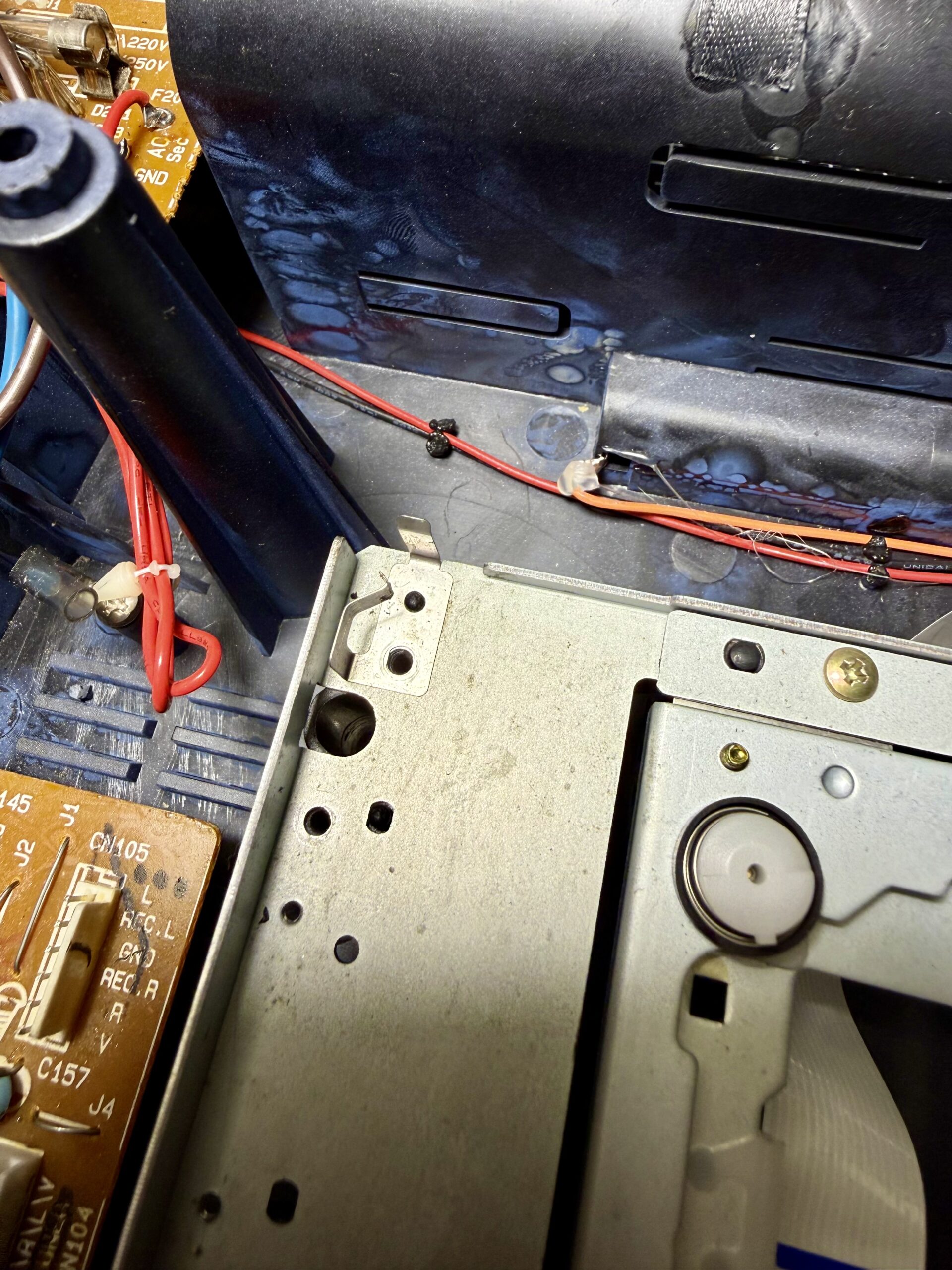 Hier ein paar Impressionen aus dem Inneren des Gerätes (Anklicken zum Vergrößern). Ich musste übrigens das CD-Laufwerk komplett überholen, da hier ein vorheriger Reparateur sein Unwesen getrieben hatte.