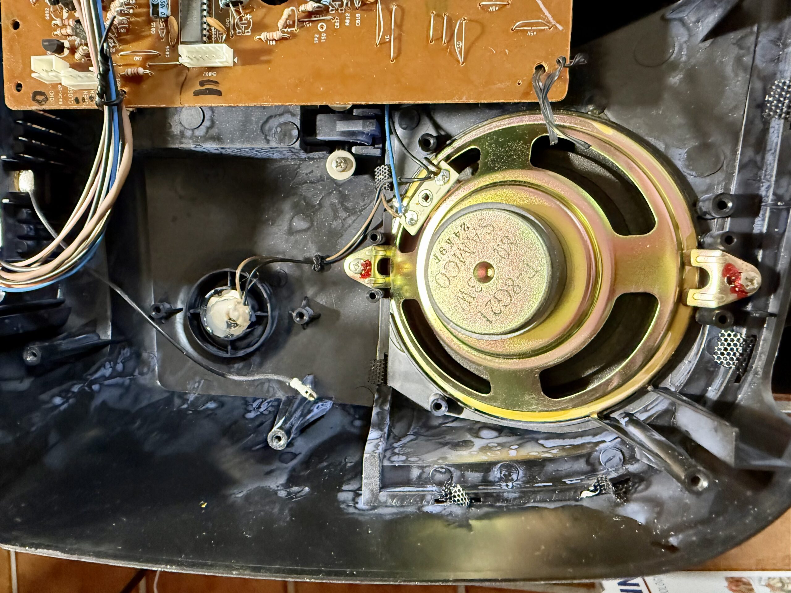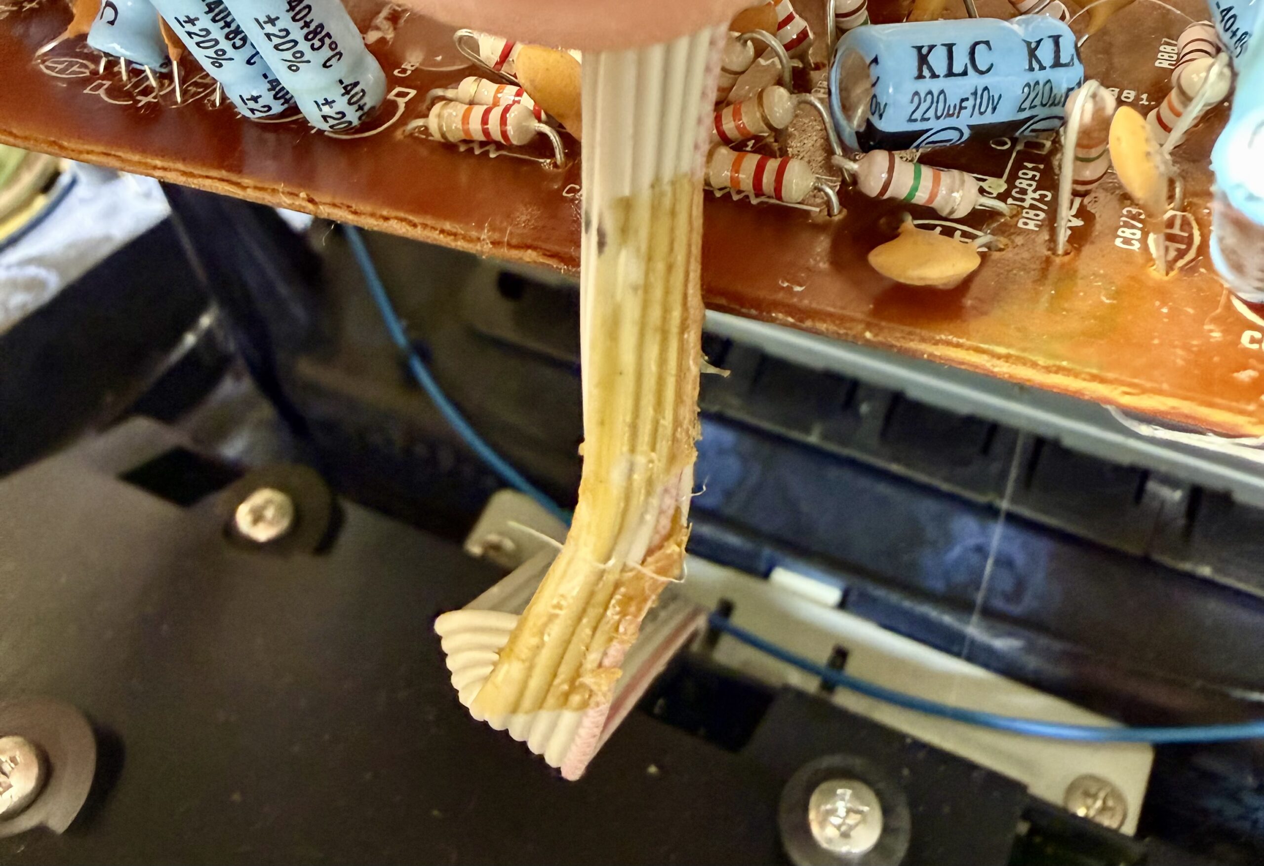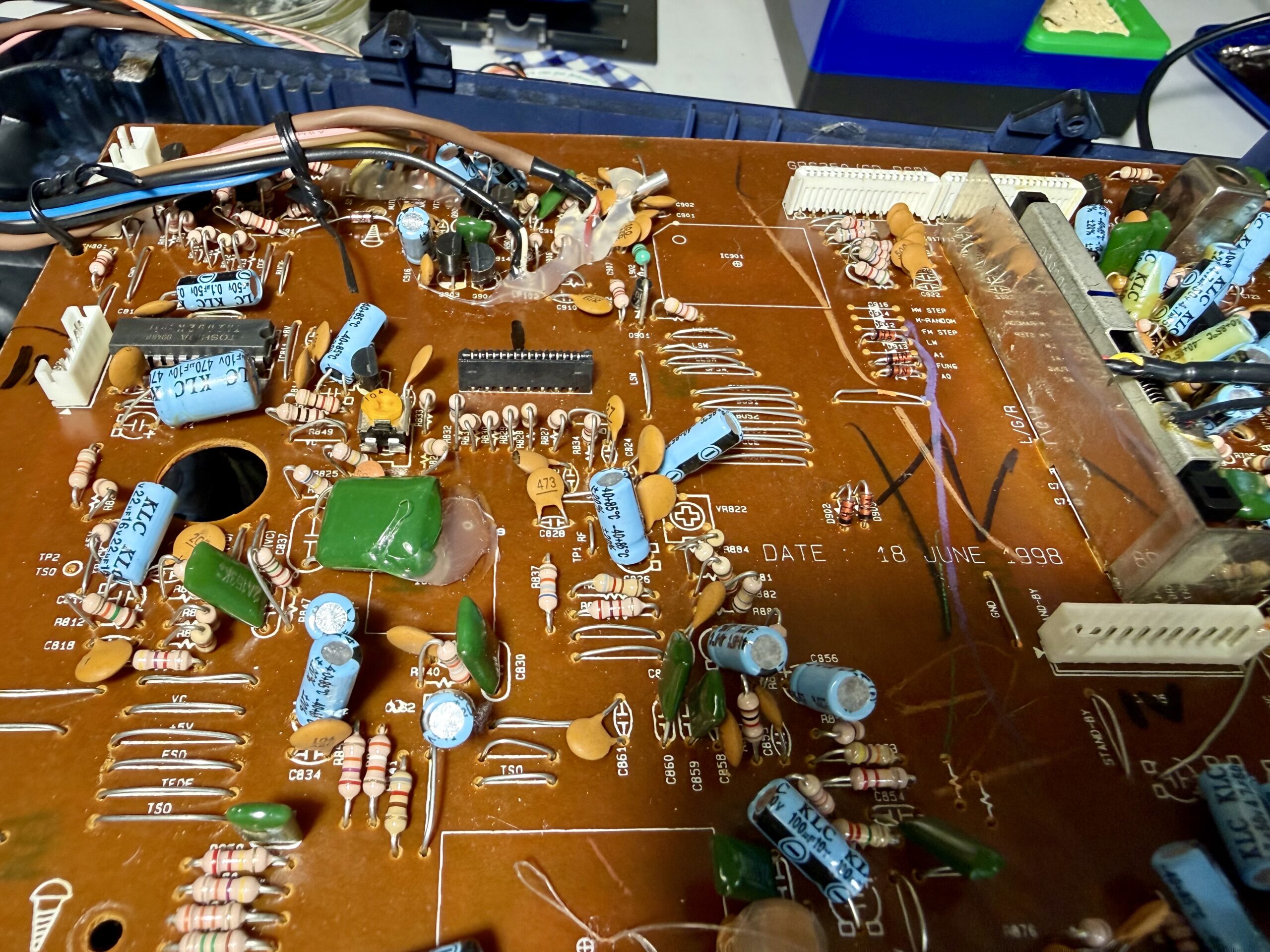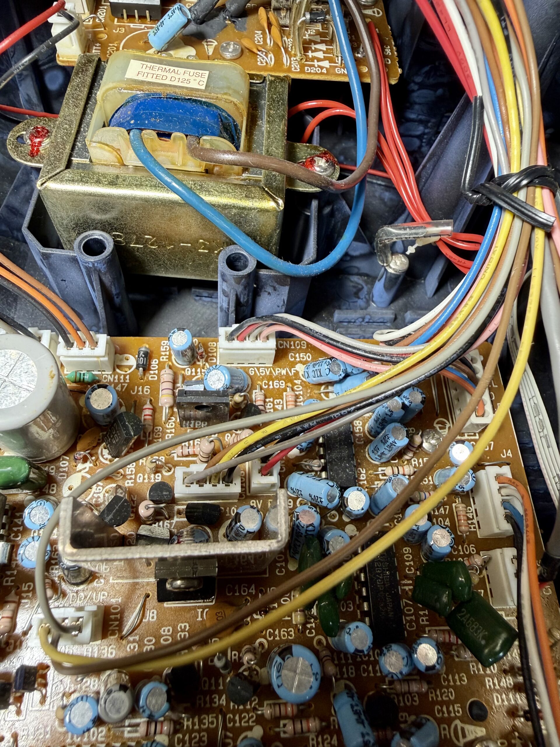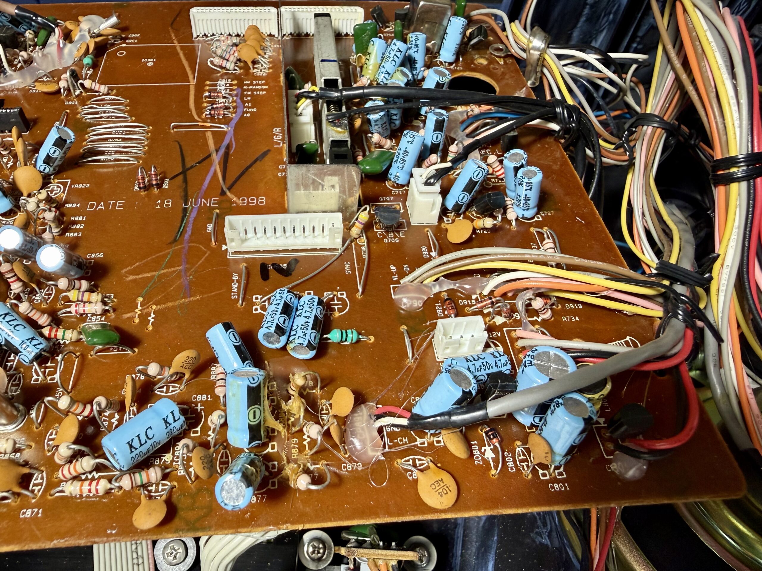 Hier ein paar Impressionen aus dem Inneren des Gerätes (Anklicken zum Vergrößern). Ich musste übrigens das CD-Laufwerk komplett überholen, da hier ein vorheriger Reparateur sein Unwesen getrieben hatte.