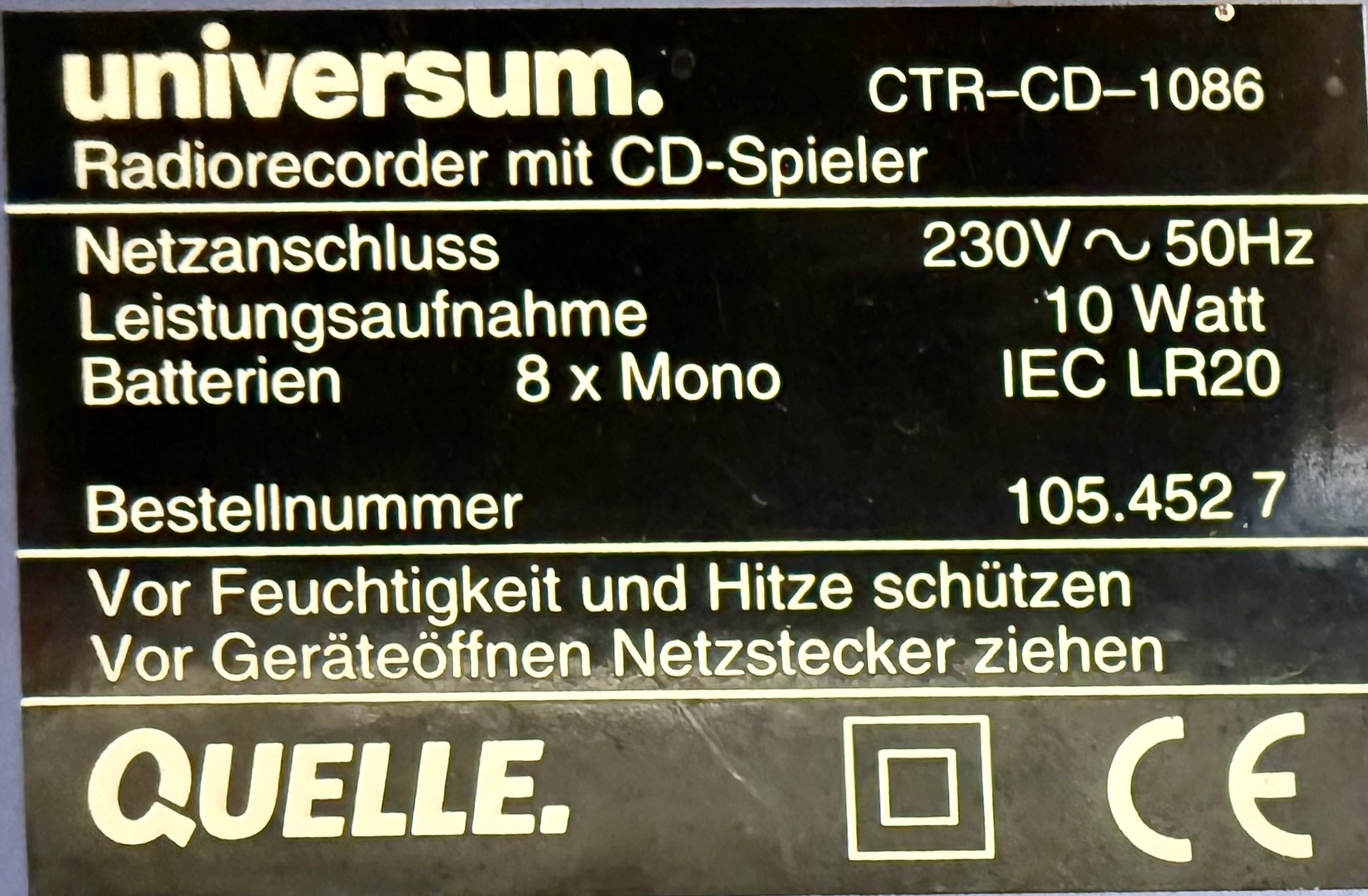Als Beispiel dient ein Gerät von Universum. Der Universum CTR-CD-1086 ist ein Kombigerät aus Radio, CD-Spieler und Kassettendeck, welches Ende der 1990er Jahre von Quelle vertrieben wurde.
