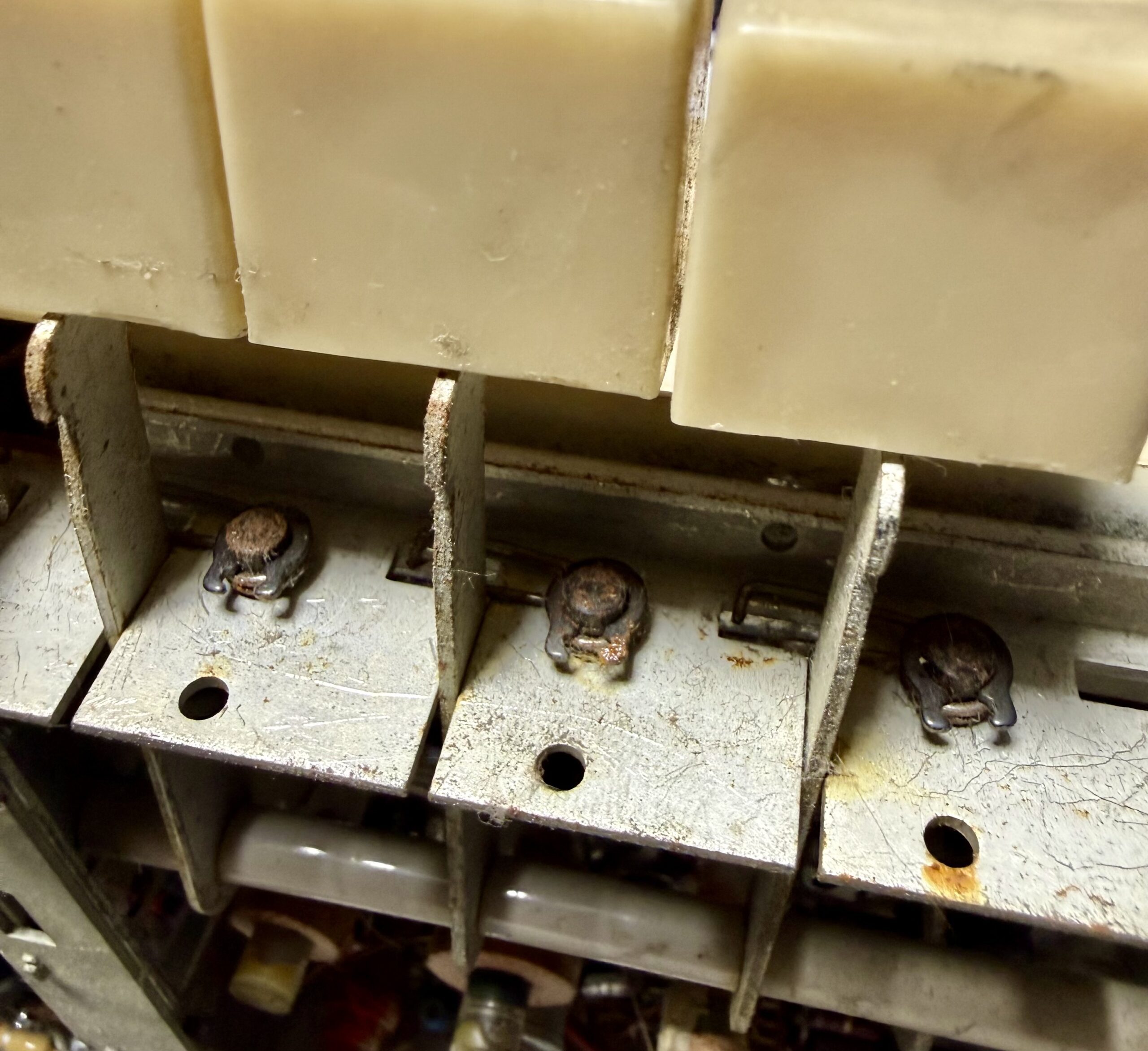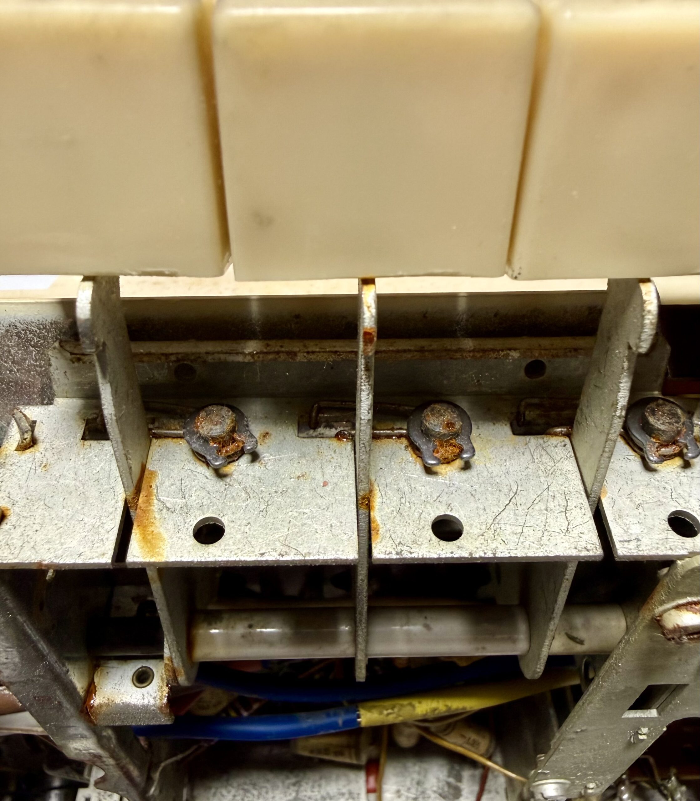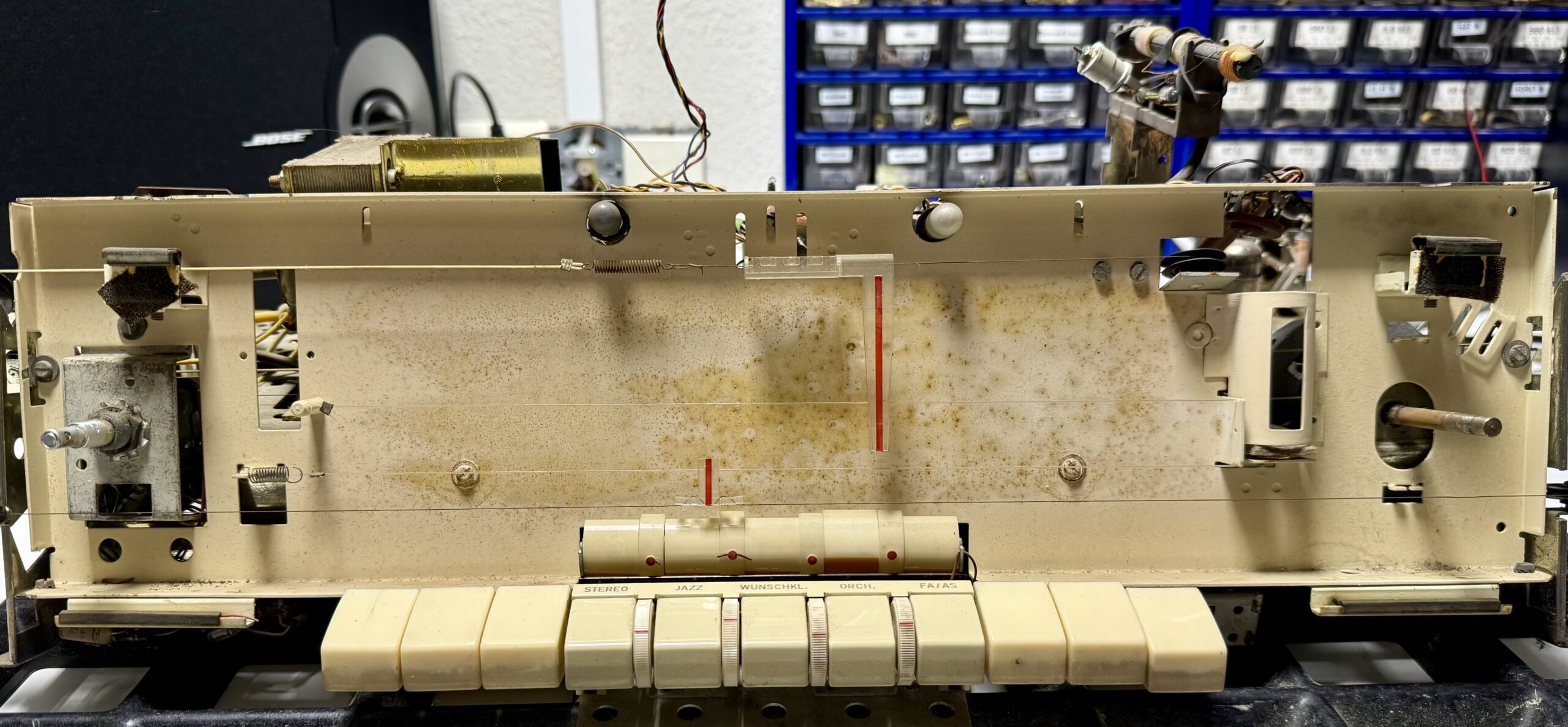 Nach der Demontage des Chassis habe ich weitere Roststellen gefunden, der Tastensatz ist vermutlich aus diesem Grund schwergängig.