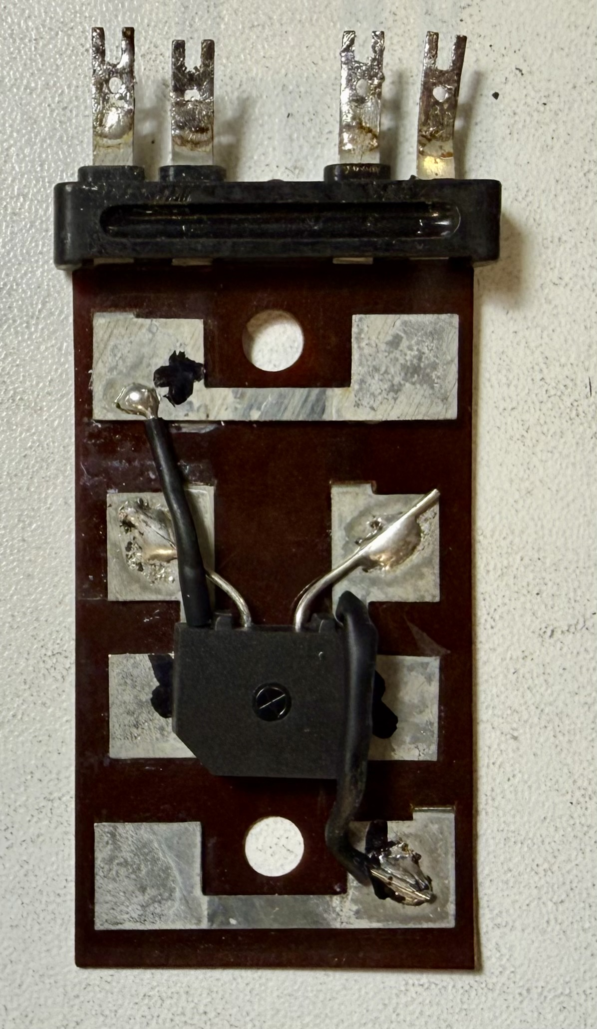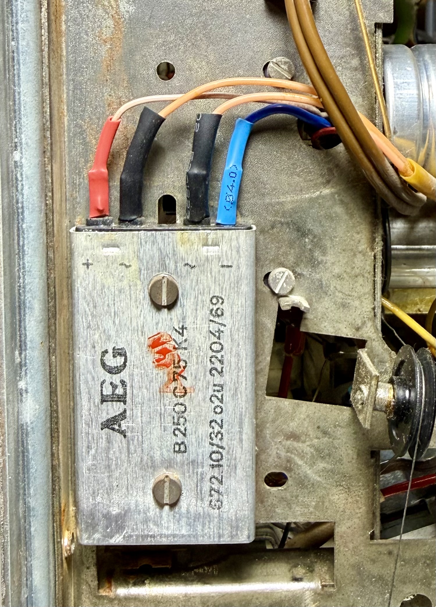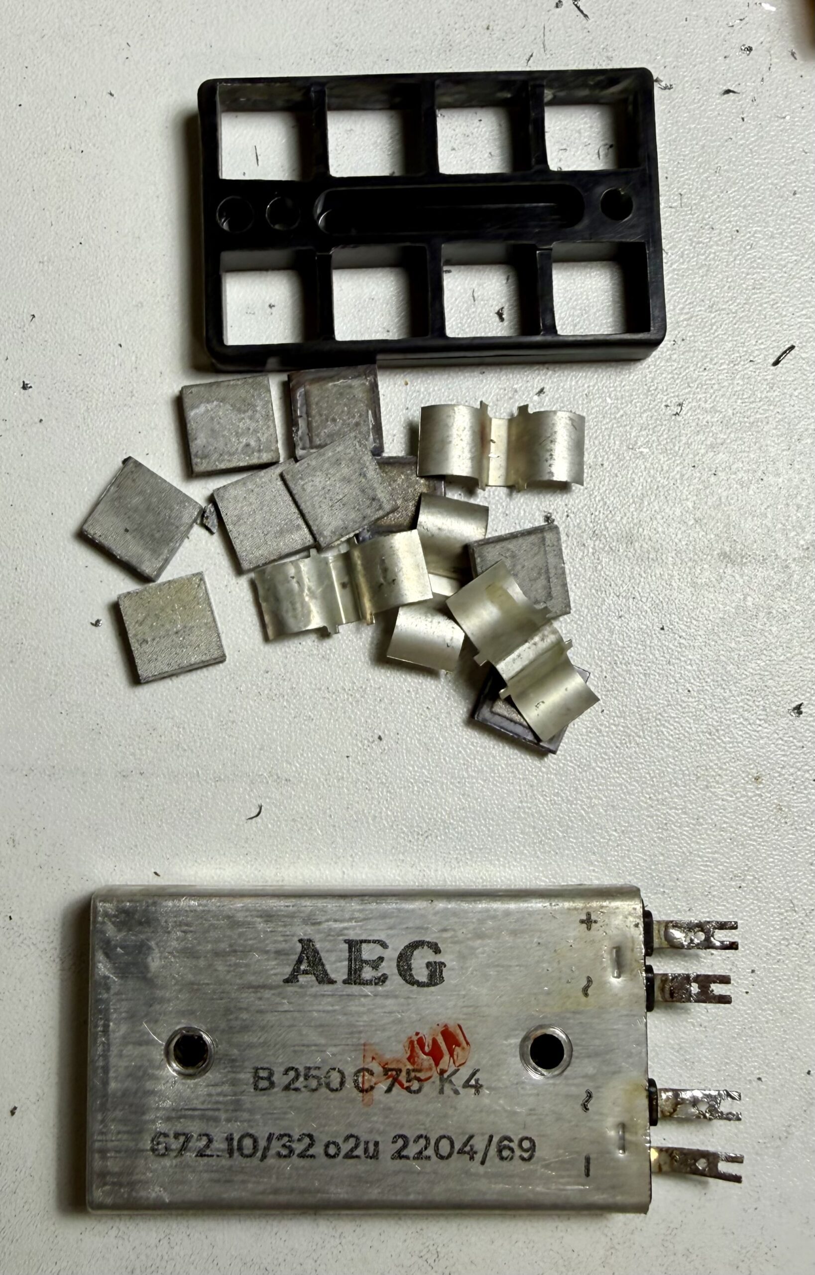Die dabei durchgeführten Spannungsmessungen zeigten allerdings, dass der Gleichrichter platt ist: Statt 270 V konnte ich dort nur 240 V messen. Ich habe ihn mit einem Silizium-Brückengleichrichter ersetzt und den fehlenden Spannungsabfall mit 2 Widerständen à 150 Ohm (3 W) sichergestellt. Auf der Lötleiste waren passend zwei Kontakte frei, die ich dazu nutzen konnte.