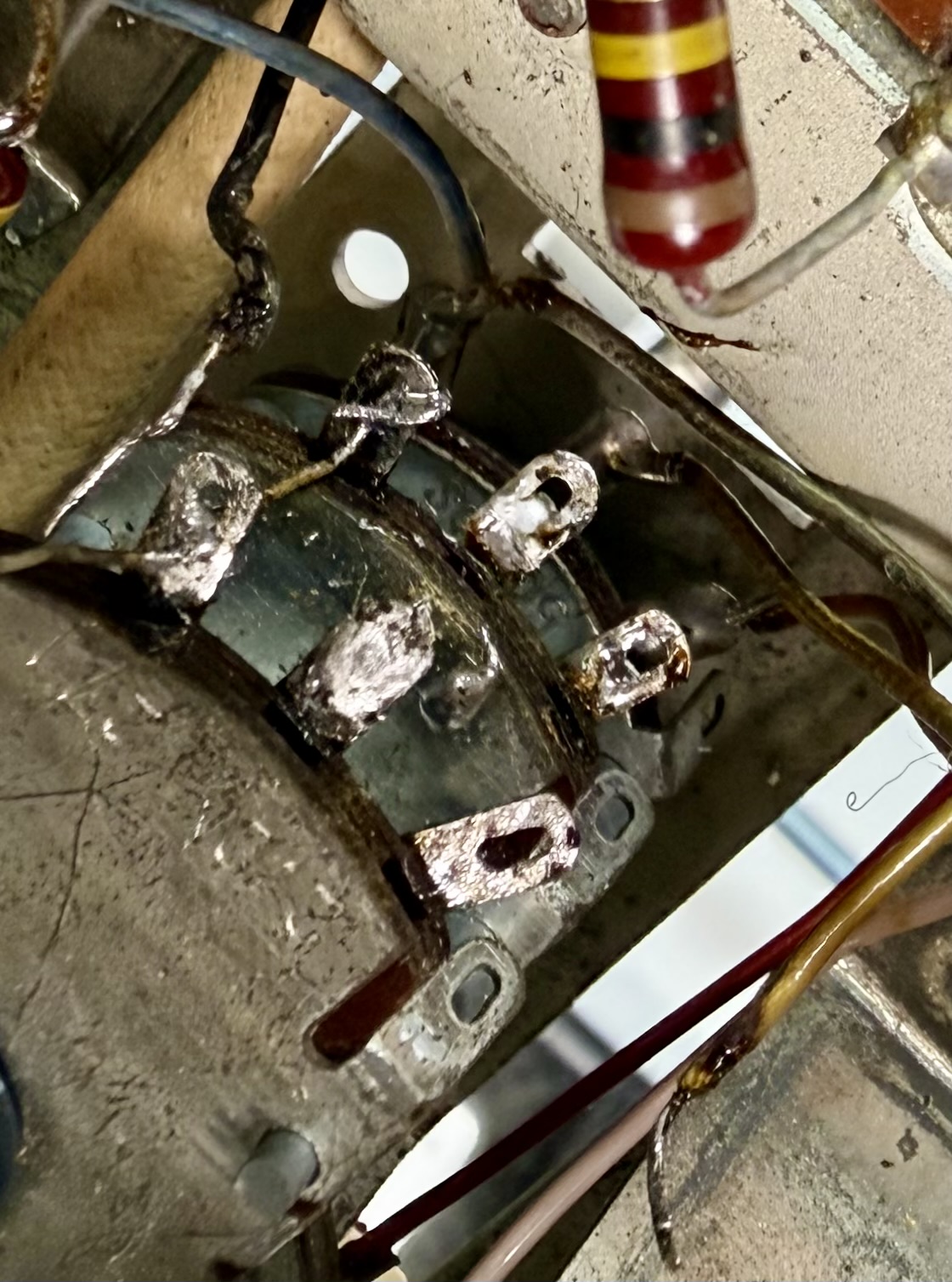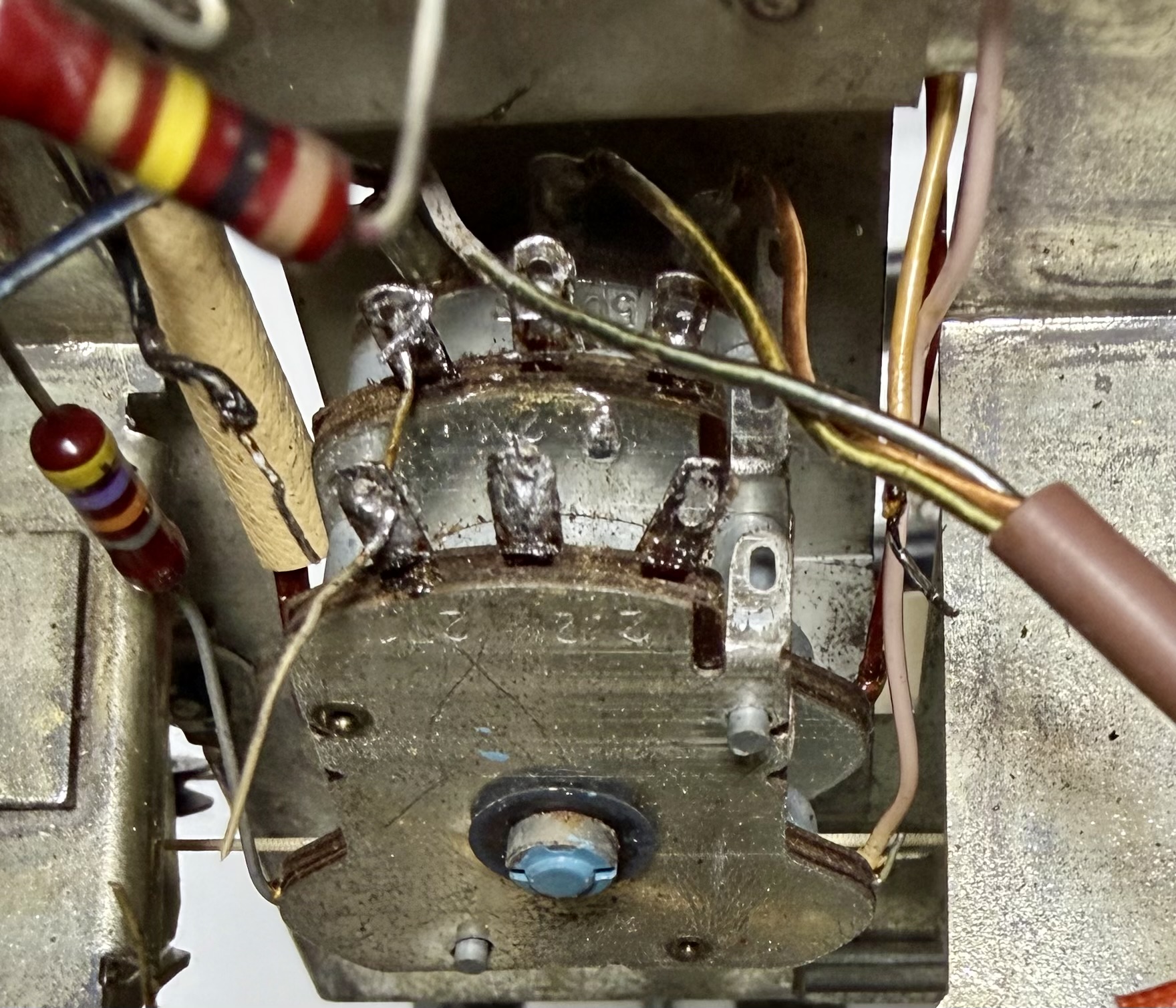 Wie so oft: Das Potentiometer für den „Stereo-Dirigenten“ (was wohl eine Art Balance-Regler sein soll) saß bombenfest. Erwärmen und WD40 oder IPA halfen überhaupt nicht. Also hieß es, das Poti auszubauen, um es zu zerlegen und zu reinigen.