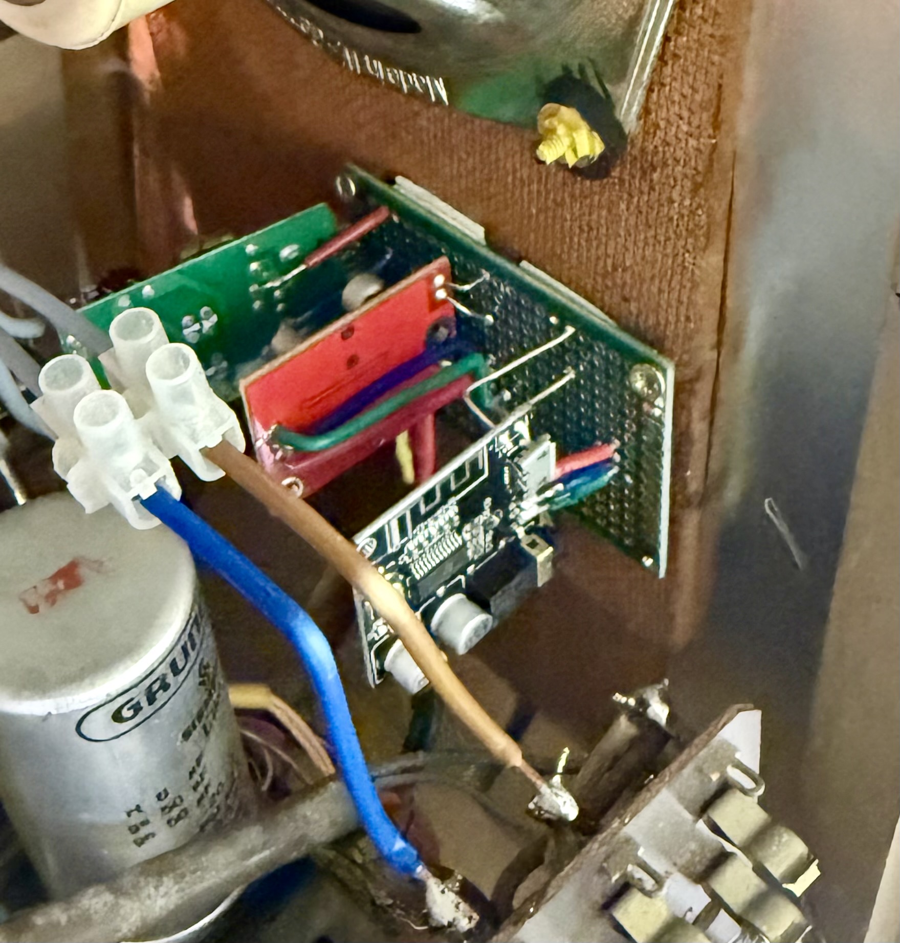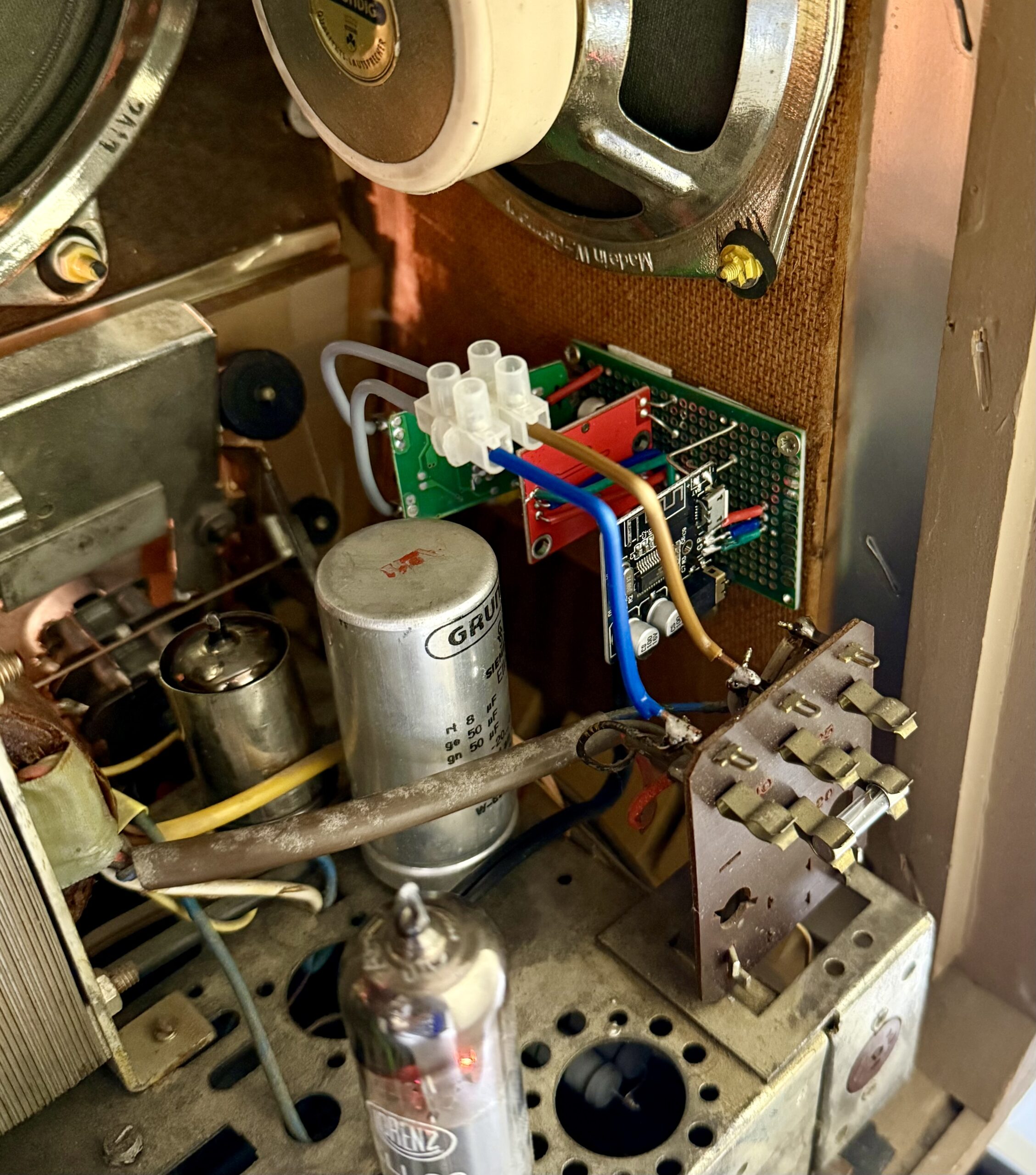 Auf Wunsch des Besitzers habe ich ein Bluetooth-Modul nachgerüstet. Um die etwas geringere Lautstärke auszugleichen, kommt ein kleiner Pre-Amp zum Einsatz.