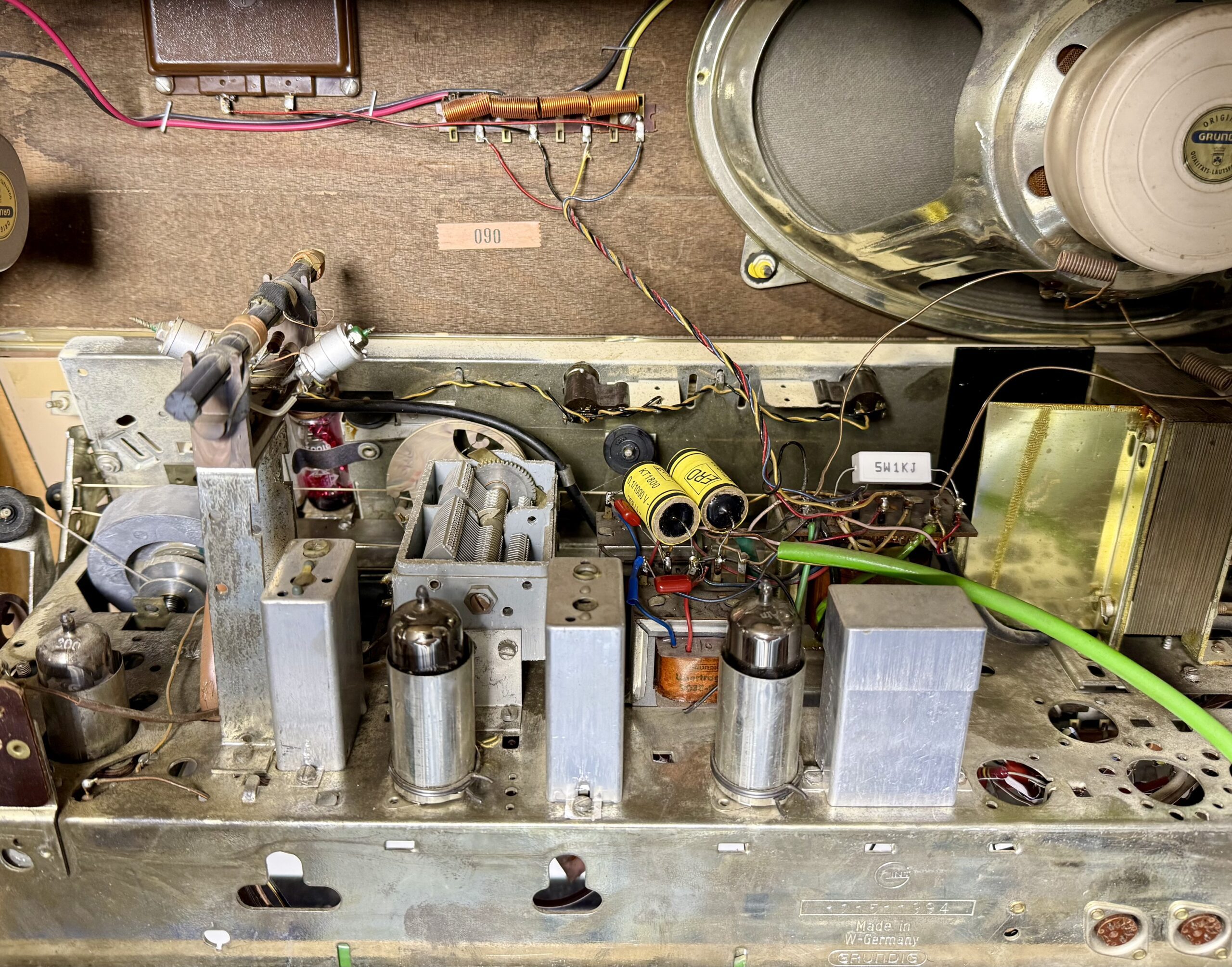 Weiter geht’s: Die Produktion dieses Radios ist vermutlich derart schrittweise erfolgt, dass eine Mitarbeiterin (es waren in der Tat meist Frauen, die die Montage erledigt haben) die Bauteile in die vorhandenen Lötösen eingesetzt hat und eine nächste danach die Lötarbeiten erledigt hat. Nur so ist zu erklären, dass nahezu alle Anschlussdrähte um die Lötösen herumgewickelt sind. Dadurch gestaltet sich das Entfernen als ziemliche Sisyphusarbeit. Ich bin schlicht kein Freund davon. die neuen Bauteile an den abgeknipsten alten Anschlussdrähten anzulöten. Die Kombination aus Lötkolben, Entlötpumpe und Geduld führt zum Ziel.