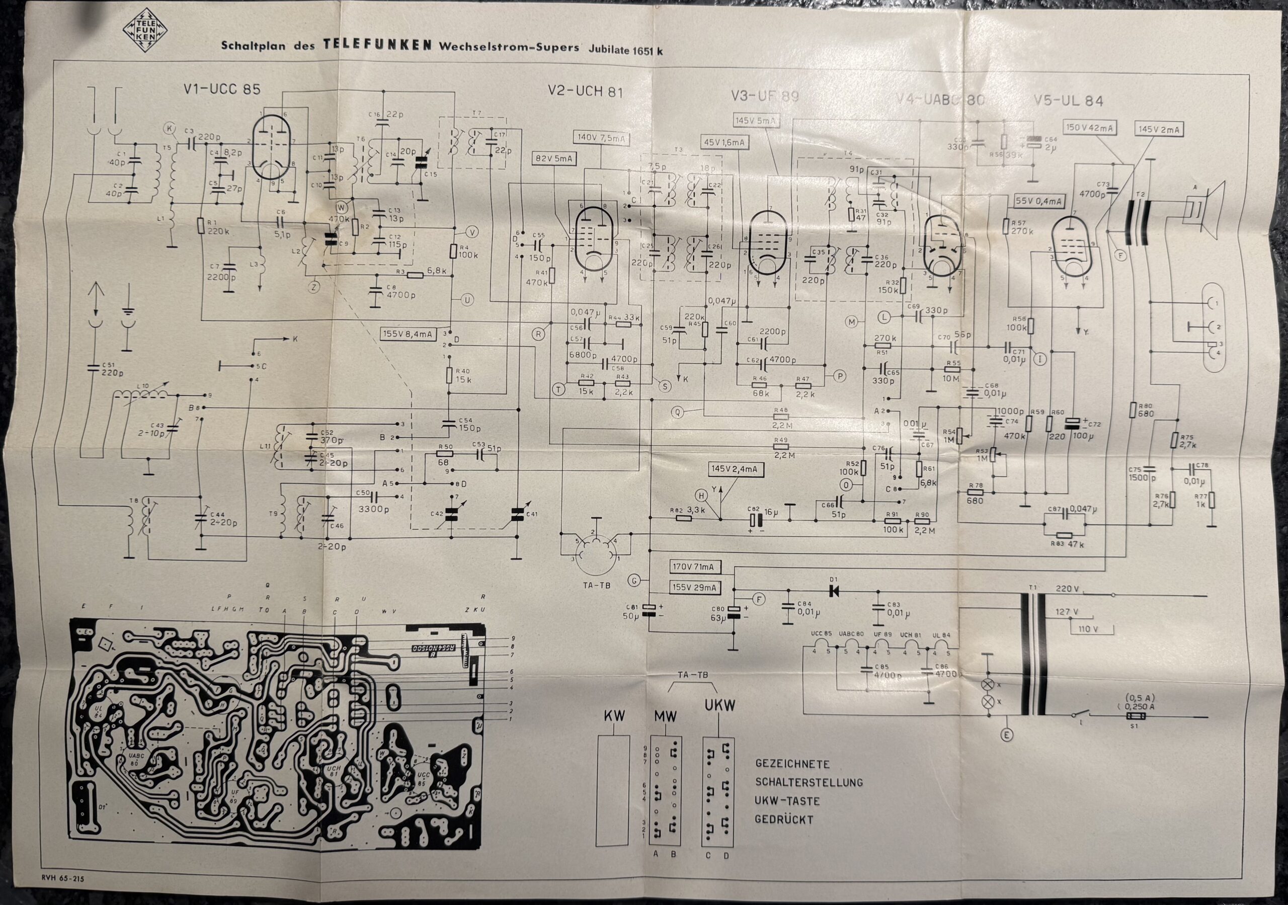 liefern. Die Stromstärke liegt bei allen bei 0,1 A. Die UCC85 mit 26 V wird separat versorgt und liegt parallel zu zwei Glühlampen (2 x 12 V in Reihe). Sehr ungewöhnlich…
